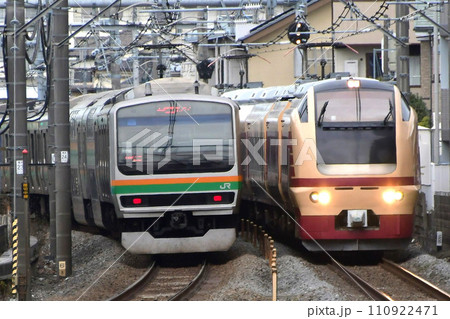離合するE653系1000番台K70編成国鉄特急色とE231系1000番台