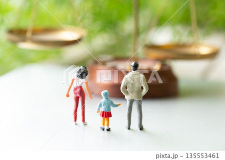 ミニチュアの子どもたちの前で向き合う男女 父母 親子 親権 イメージ
