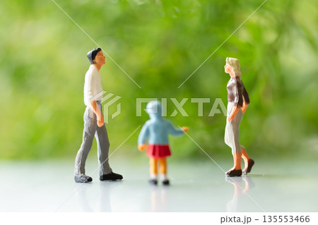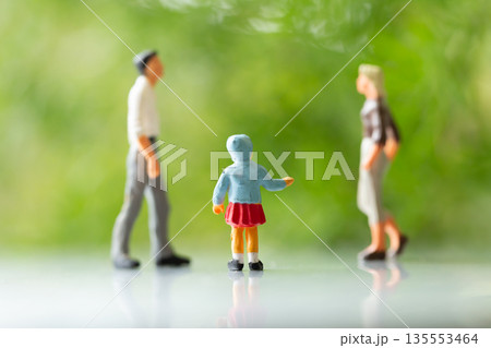 ミニチュアの子どもの前で向き合う男女 父母 親子 親権 離婚 イメージ