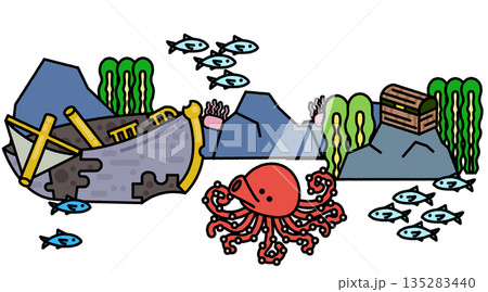 沈没船と海の生き物たちを描いた海中のイラスト背景