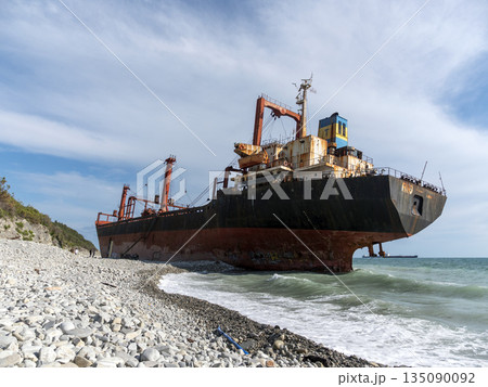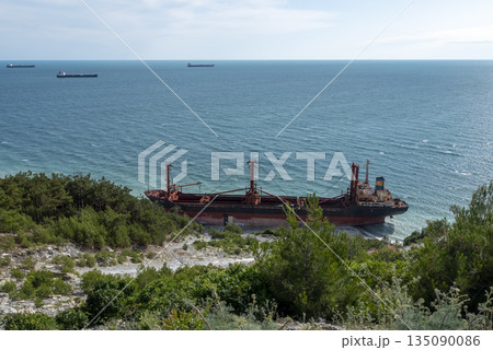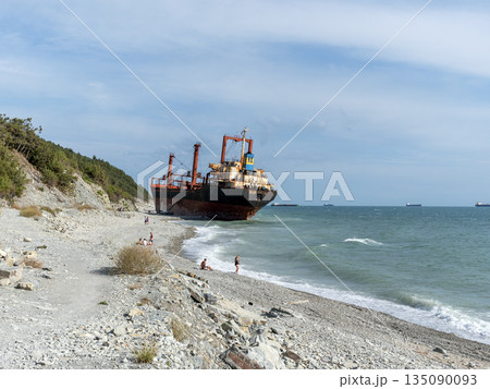 August 22 2025 Cargo ship RIO grounded near the shore of Kabardinka on the Black Sea coast Russia. Large vessel stranded close to the coastline after a maritime incident