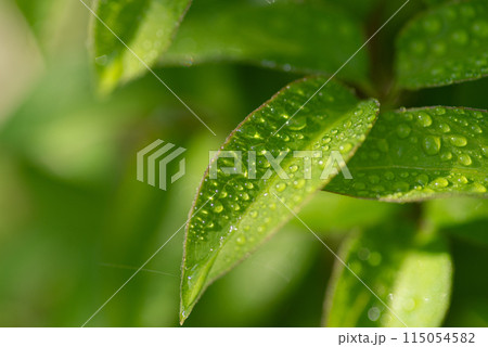 青々した葉っぱに雨の水滴がついた6月の梅雨のイメージ