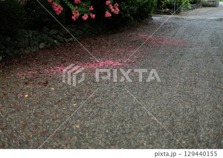 雨の参道と散り落ちた赤い花びら