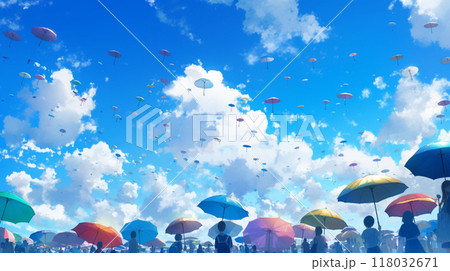青空の下で傘をさす人たくさんの人達と浮かぶ傘
