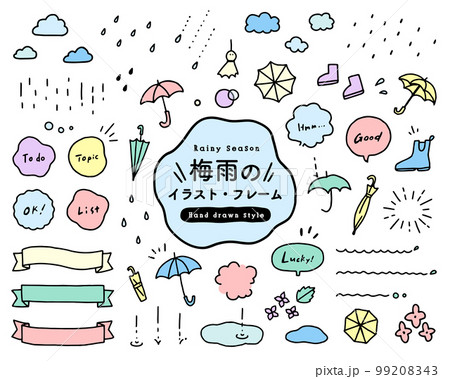 梅雨の手描きイラストとフレームのセット 6月 傘 長靴 雲 シンプル 飾り リボン 吹き出し 装飾