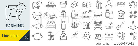 ベクターでモノクロの酪農に関する線画アイコンセット