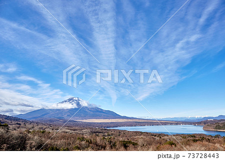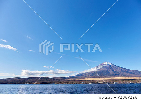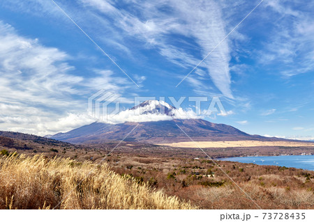 冬、積雪量が少ない富士山 山中湖の長池親水公園より 山梨県