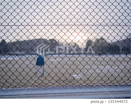 冬の朝の公園の積雪のグランドで野球を練習する子供の様子