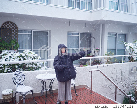 冬の朝の住宅のエントランスで雪遊びしている女の子の子供の様子