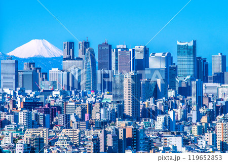 日本の東京都市景観 新景。変貌する新宿。富士山と新宿副都心などを望む