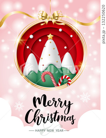 3D聖誕樹、圓形聖誕裝飾球框和粉色下雪雪景背景,聖誕節直式廣告海報宣傳單素材圖片