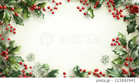 ヒイラギと赤い実が美しく飾られた、シンプルでエレガントなクリスマスフレームデザイン