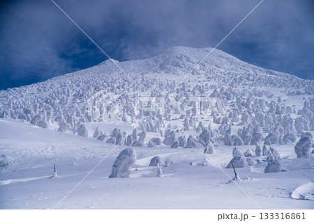 冬の澄んだ青空の下、力強くそびえ立つ美しい樹氷