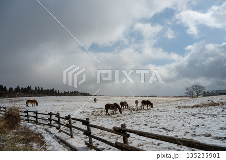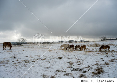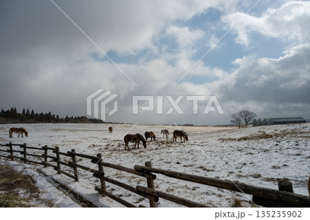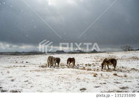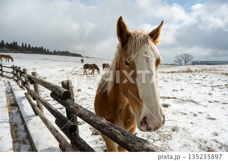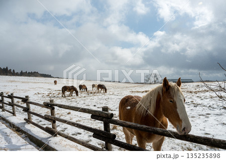 雪景色の中阿蘇雪原を馬が駆ける