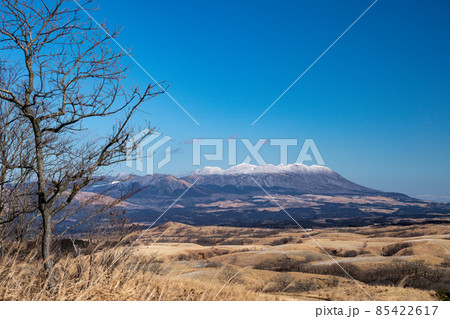 冬の青空に雪化粧した阿蘇の風景