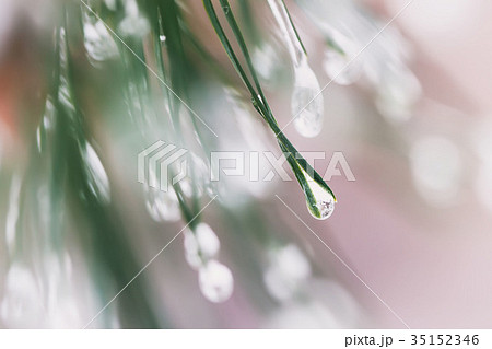 Close-up of Pine needles with ice drops, bokeh