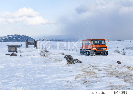 (山形県)晩秋の山形蔵王高原 出番を待つ雪上車・圧雪車
