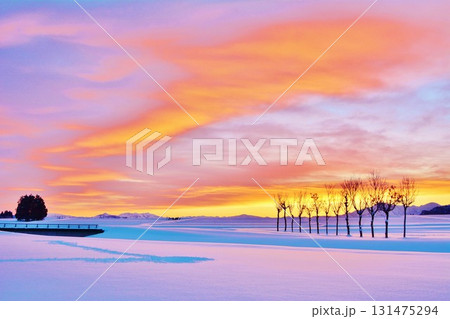 北海道冬の美瑛-夕陽のセブンスターのきの白樺並木-