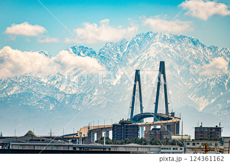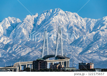 冬の立山連峰を背にする新湊大橋