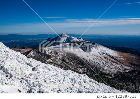 早春の快晴の青空をバックに残雪の御嶽山を望む