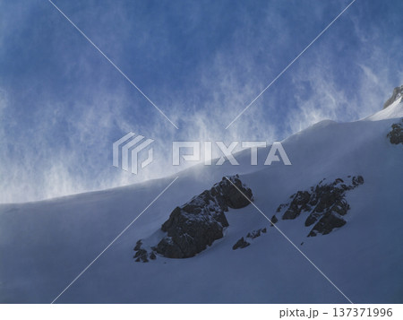 冬山に射す強い光 雪煙が舞う稜線の風景