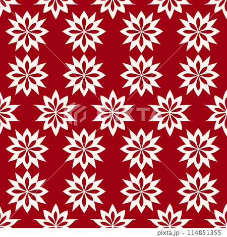 A Japanese style pattern with white flowers on a red background, in a symmetrical design with a repeating pattern.