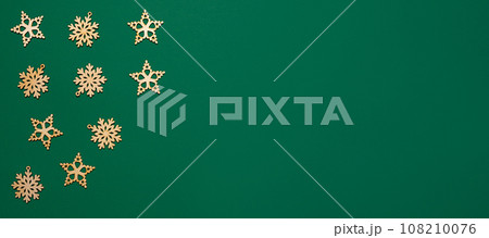 New Year Green Background. Wooden Decoration. Stars and Snowflakes shape. Top view. Confetti Festive Backdrop. Noel Banner Template. Xmas Frame. Sustainable Christmas, plastic free, ecofriendly Mockup