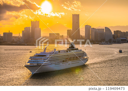 日本の横浜都市景観 富士山やみなとみらい、飛鳥Ⅱ、桜木町駅方向などを望む
