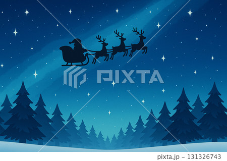 満月の夜にソリを駆るサンタクロースとトナカイの幻想的な風景