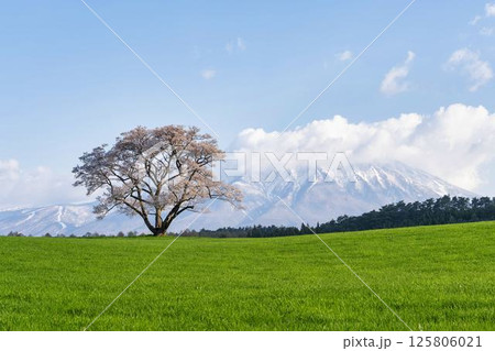 岩手山と1本桜 緑と青のコントラストが美しい春の雪山