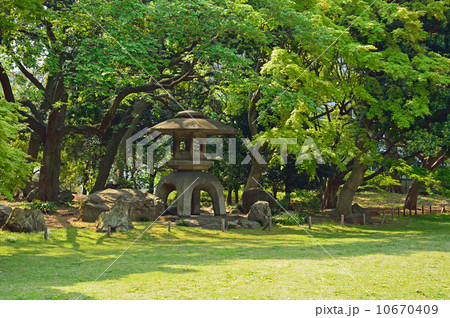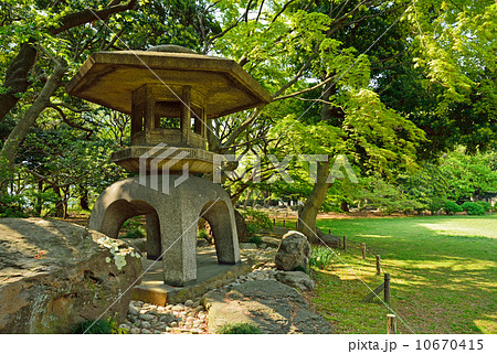 旧古河庭園の雪見灯篭と水面に映える景観 若葉に新緑
