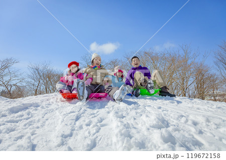 雪の公園でソリ遊びをする4人家族