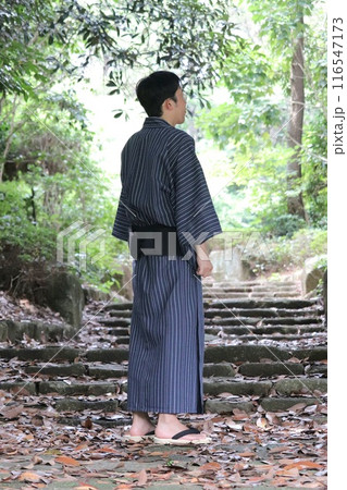 散歩する浴衣の男性の後ろ姿