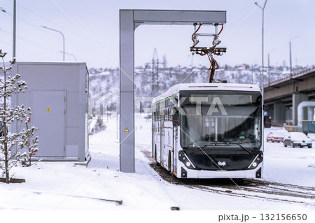 An Electric Tram is Traveling Through a Beautiful and Serene Winter Landscape Covered in Soft Snow
