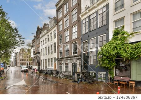 Beautiful view of Amsterdam's iconic canal-side buildings, showcasing unique facades along a rainy street and lush greenery.
