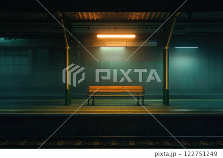 Lonely Train Station Platform at Night with Illuminated Bench for Reflective Design Use