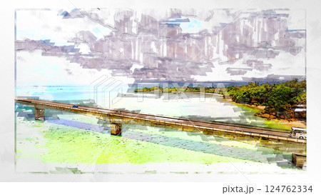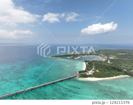綺麗な海が広がる沖縄県宮古島と池間島を結ぶ長い池間大橋をドローンを使って空撮