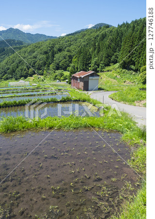 田植えを終えた若桜氷ノ山の棚田の風景 鳥取県 若桜町
