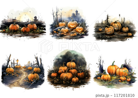 Six Watercolor Paintings Featuring Jack-O'-Lantern Pumpkins in Various Autumnal Settings