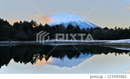 冬1月 本栖湖 龍神池に鏡のように映る雲隠れしたダイヤモンド富士
