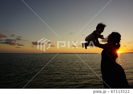 夕焼けの海辺のママと赤ちゃん