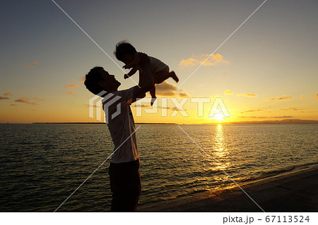夕焼けの海辺のパパと赤ちゃん