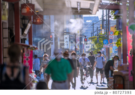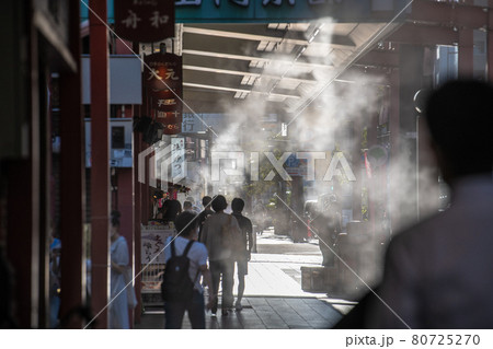 日本の東京都市景観 緊急事態宣言下。浅草寺前の商店街。ミストシャワー が涼をさそう…=8月4日