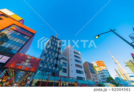 日本の東京都市景観 浅草の観音通りなどを望む(右に東京スカイツリー)
