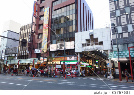 日本の東京都市景観 浅草・浅草寺雷門近くの雷門一之宮商店街などを望む(奥に浅草駅出入口)