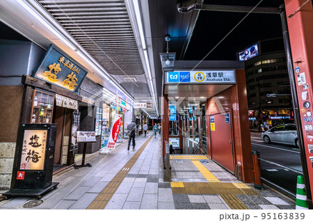 日本の東京都市景観 東京メトロ銀座線浅草駅出入口3などを望む(奥は吾妻橋交差点)