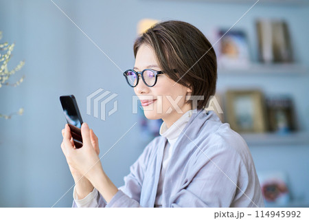 仕事の通勤中にスマートフォンで電子書籍を読む女性会社員のイラスト