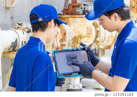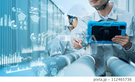 タブレットを見ながら配管・機械を点検するエンジニアのグループ