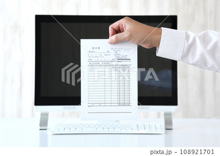 パソコンと請求書を持ったビジネスマンの手