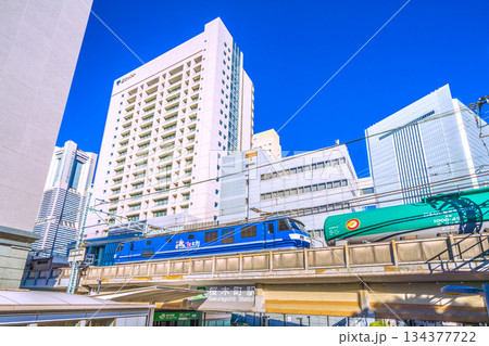 日本の横浜市景観 桜木町駅 南口や通過するEF210-113(JR貨物EF210形電気機関車)…